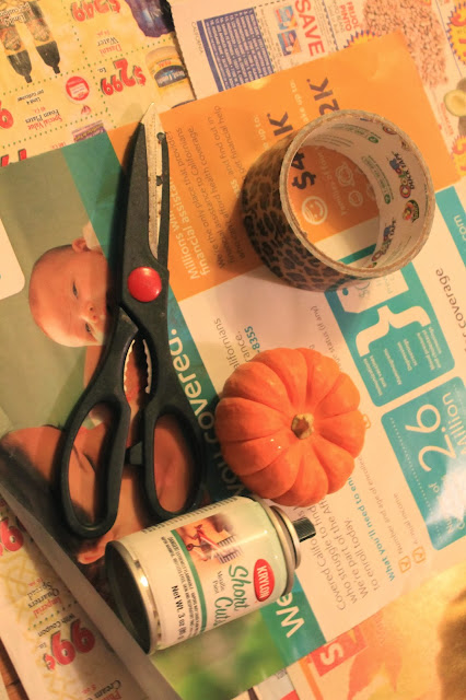 | What you need: Scissors, Scotch tape, Mini pumpkins, Metallic paint (gold) from Krylon, and newspapers |